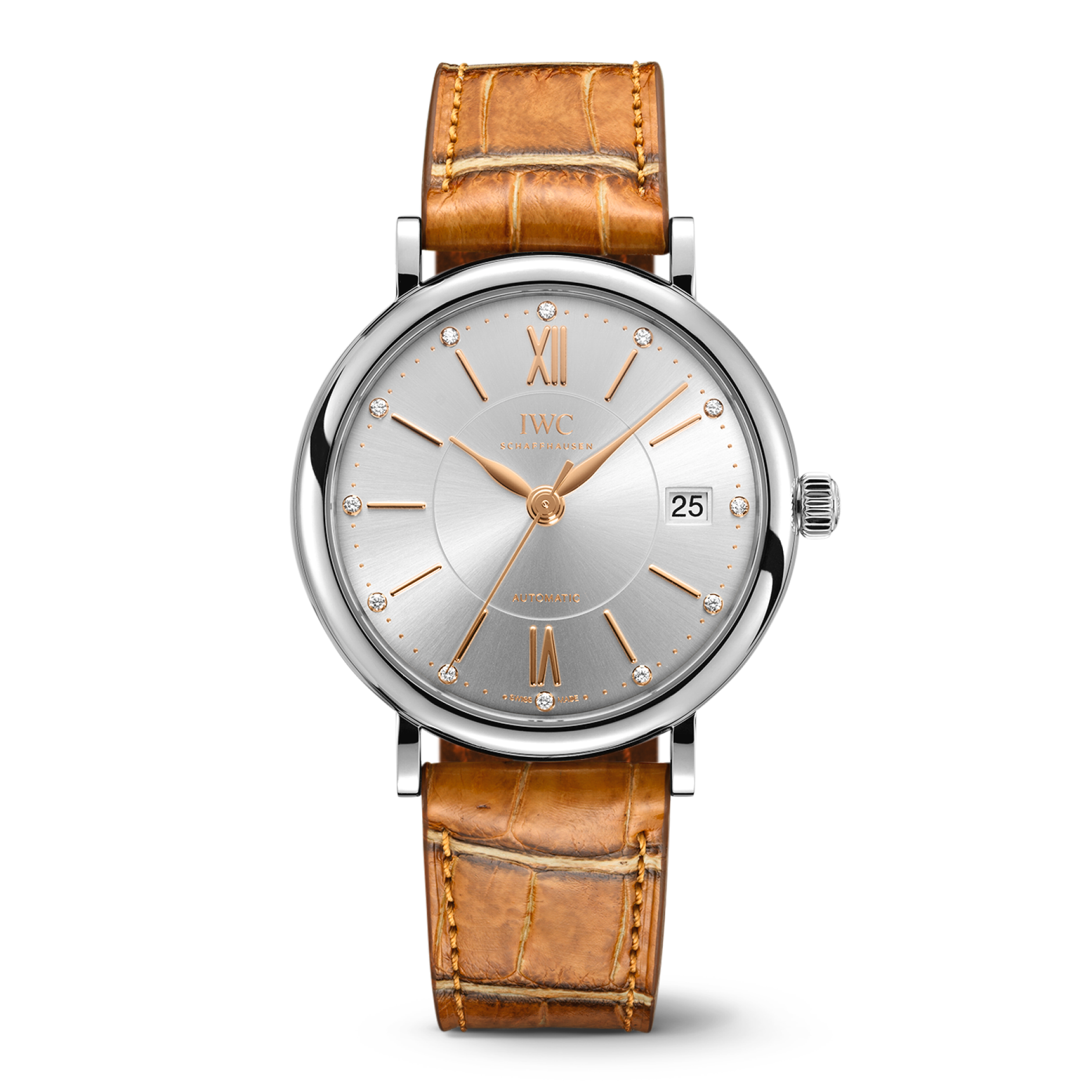 IWC Schaffhausen Portofino Automático 37 mm Esfera plateada Acero inoxidable Correa de piel de aligátor marrón claro IW458101