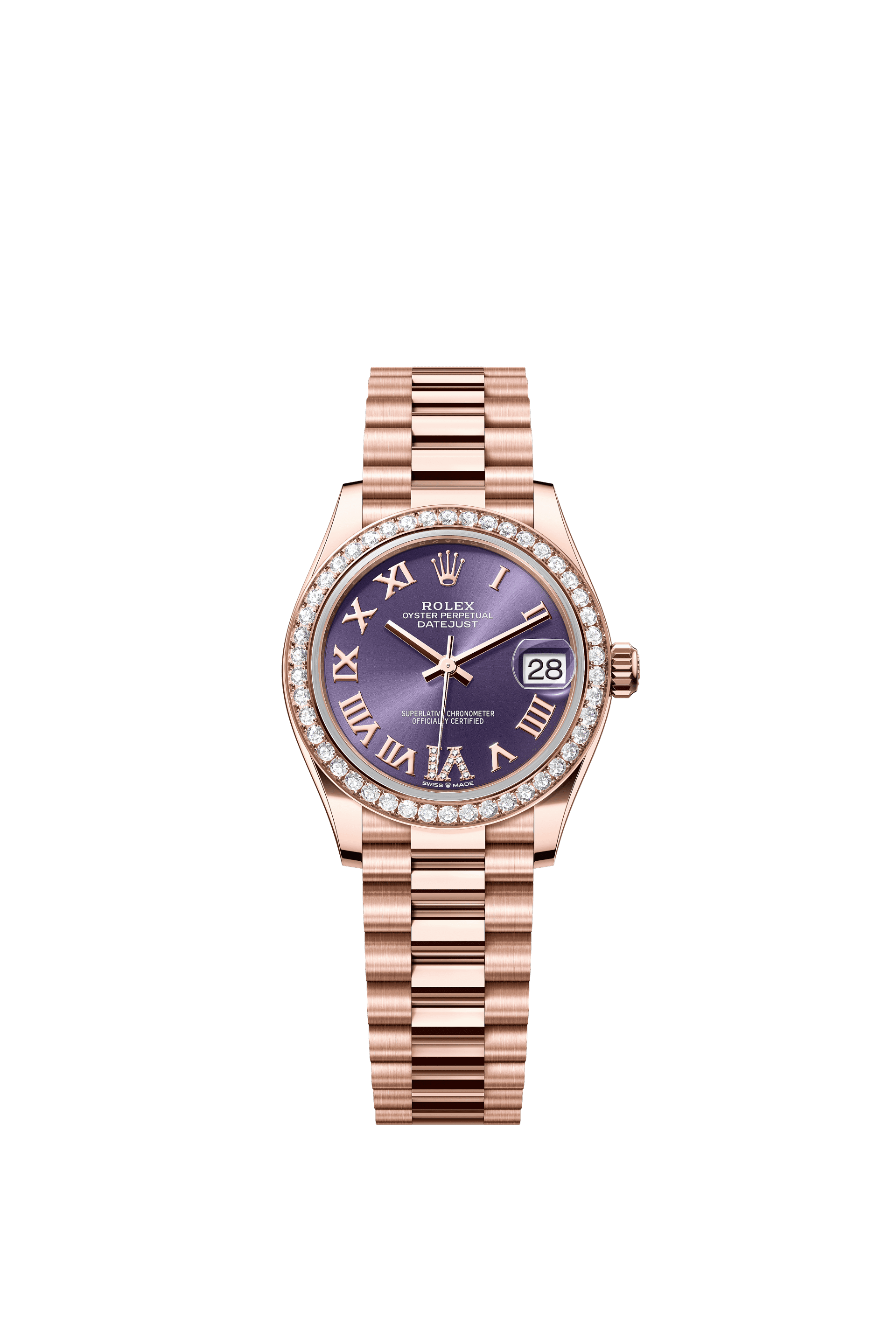 Distinguished by its Everose Gold case and Aubergine Diamond dial, reference 278285RBR exemplifies precision engineering protected by scratch-resistant sapphire crystal. This sophisticated timepiece harmoniously balances aesthetic refinement with mechanical excellence.