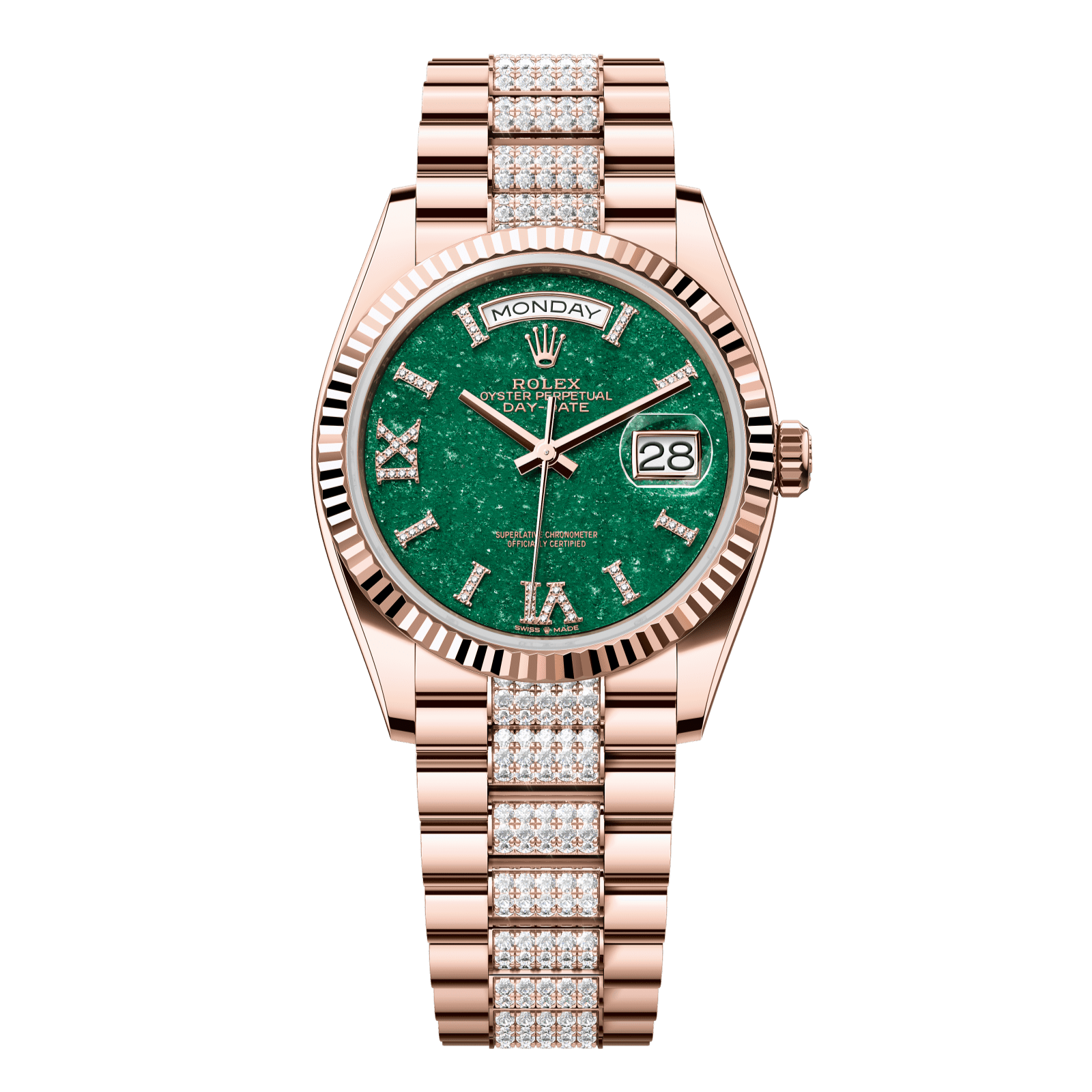Rolex Day-Date 36 36 mm Green Aventurine Set With Diamonds Dial 18 kt Everose Gold President Bracelet 128235-0069