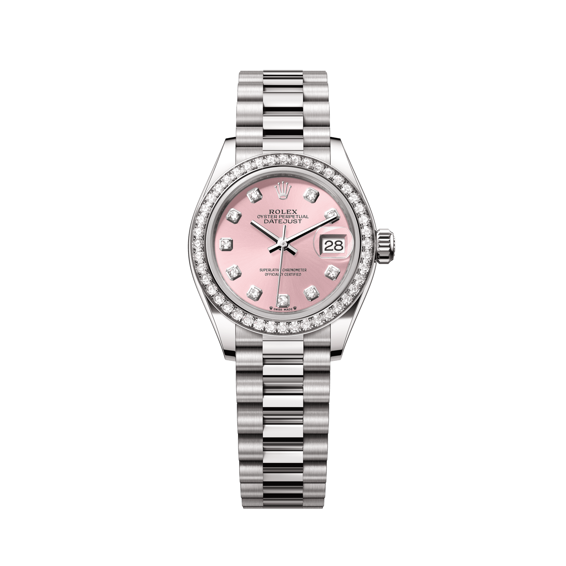 Rolex Oyster 28 mm Pink Set With Diamonds Dial 18 kt White Gold President, Semi-Circular Three-Piece Links 279139rbr-0005