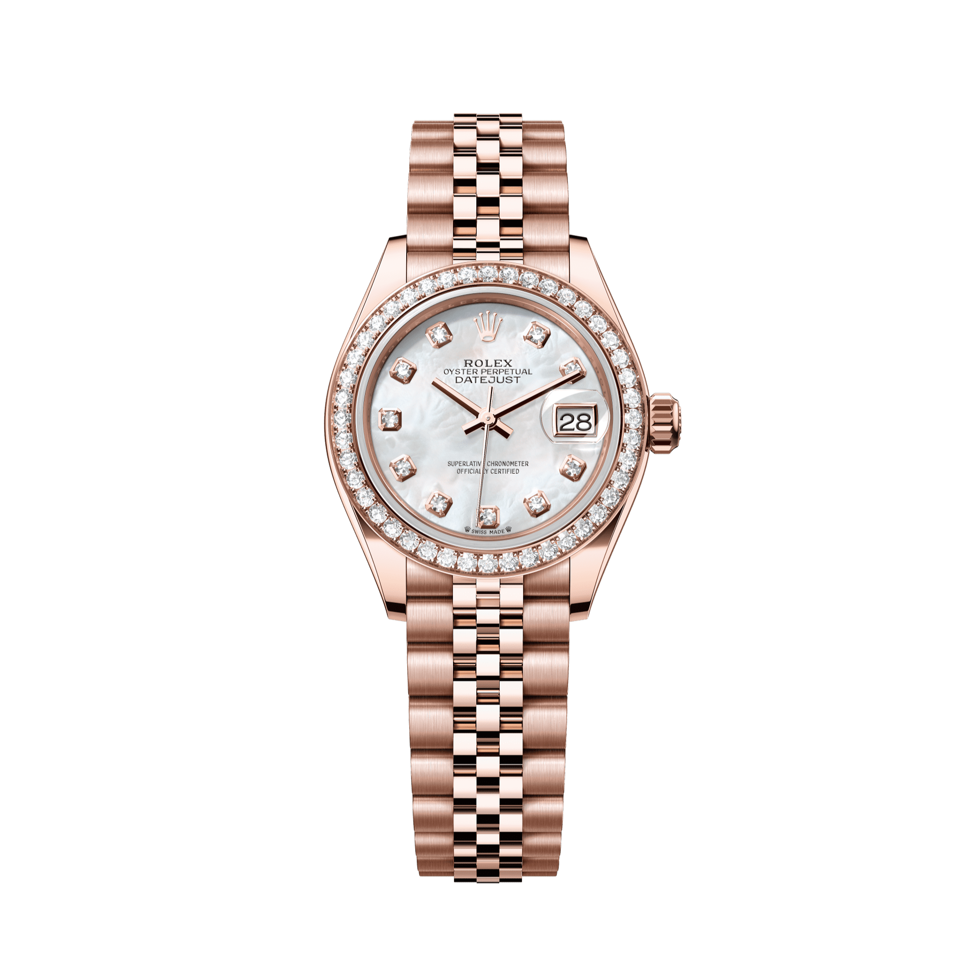 Distinguished by its 18 kt Everose Gold case and White Mother-Of-Pearl Set With Diamonds dial, reference 279135rbr-0019 exemplifies precision engineering protected by scratch-resistant sapphire crystal. This sophisticated timepiece harmoniously balances aesthetic refinement with mechanical excellence.
