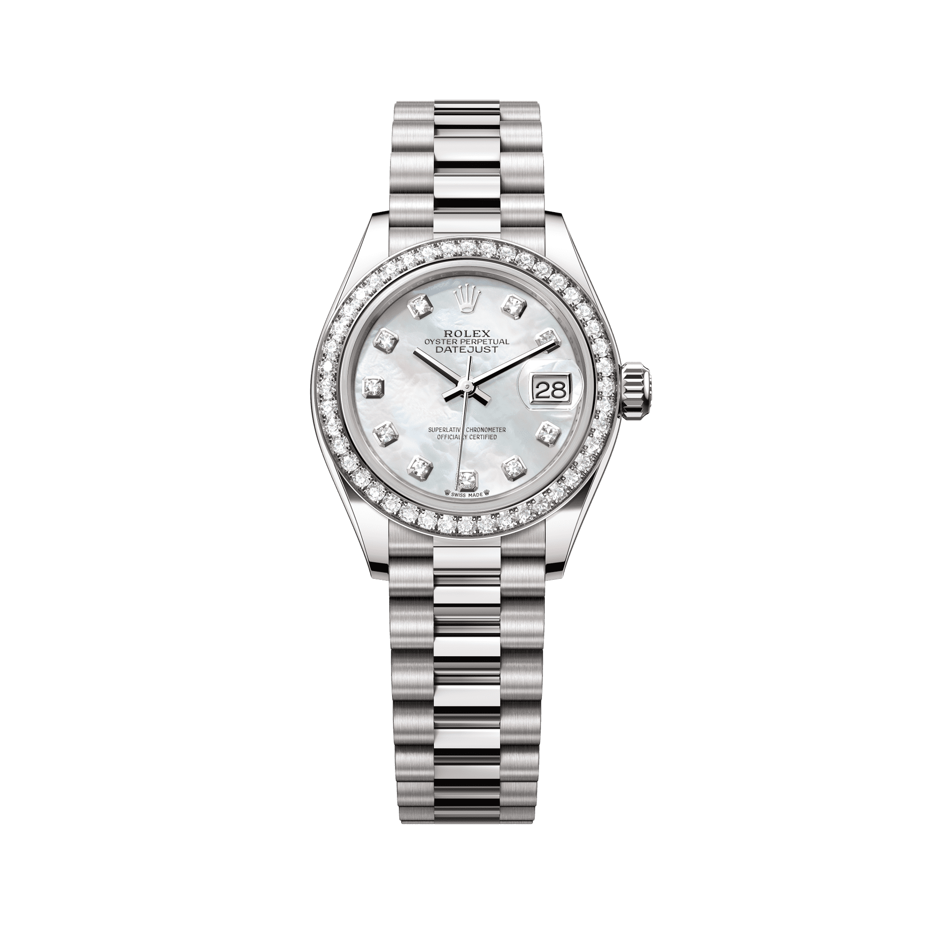 Rolex Oyster 28 mm White Mother-Of-Pearl Set With Diamonds Dial 18 kt White Gold President, Semi-Circular Three-Piece Links 279139rbr-0008