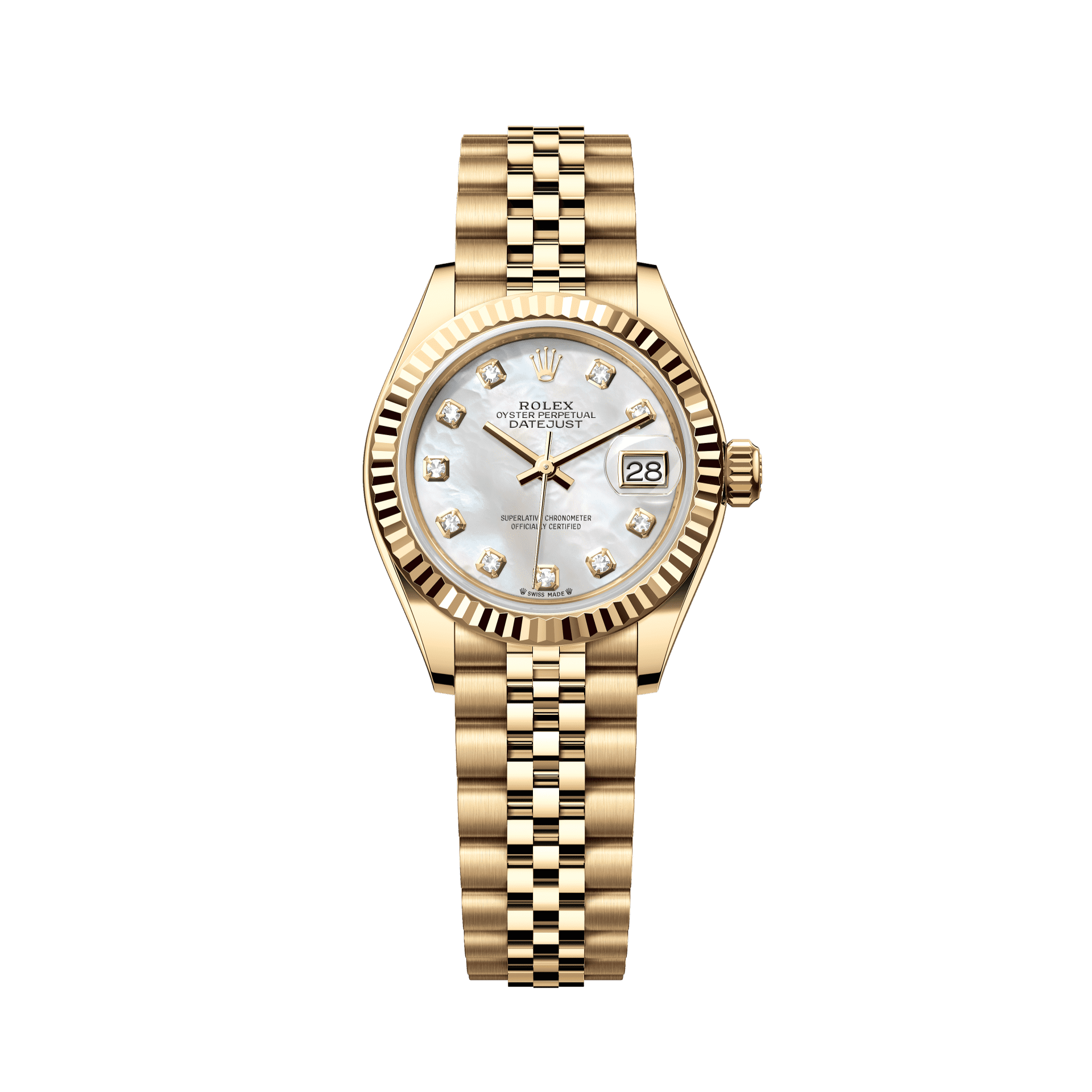 Rolex Oyster 28 mm White Mother-Of-Pearl Set With Diamonds Dial 18k Yellow Gold Jubilee Bracelet. 279178-0026