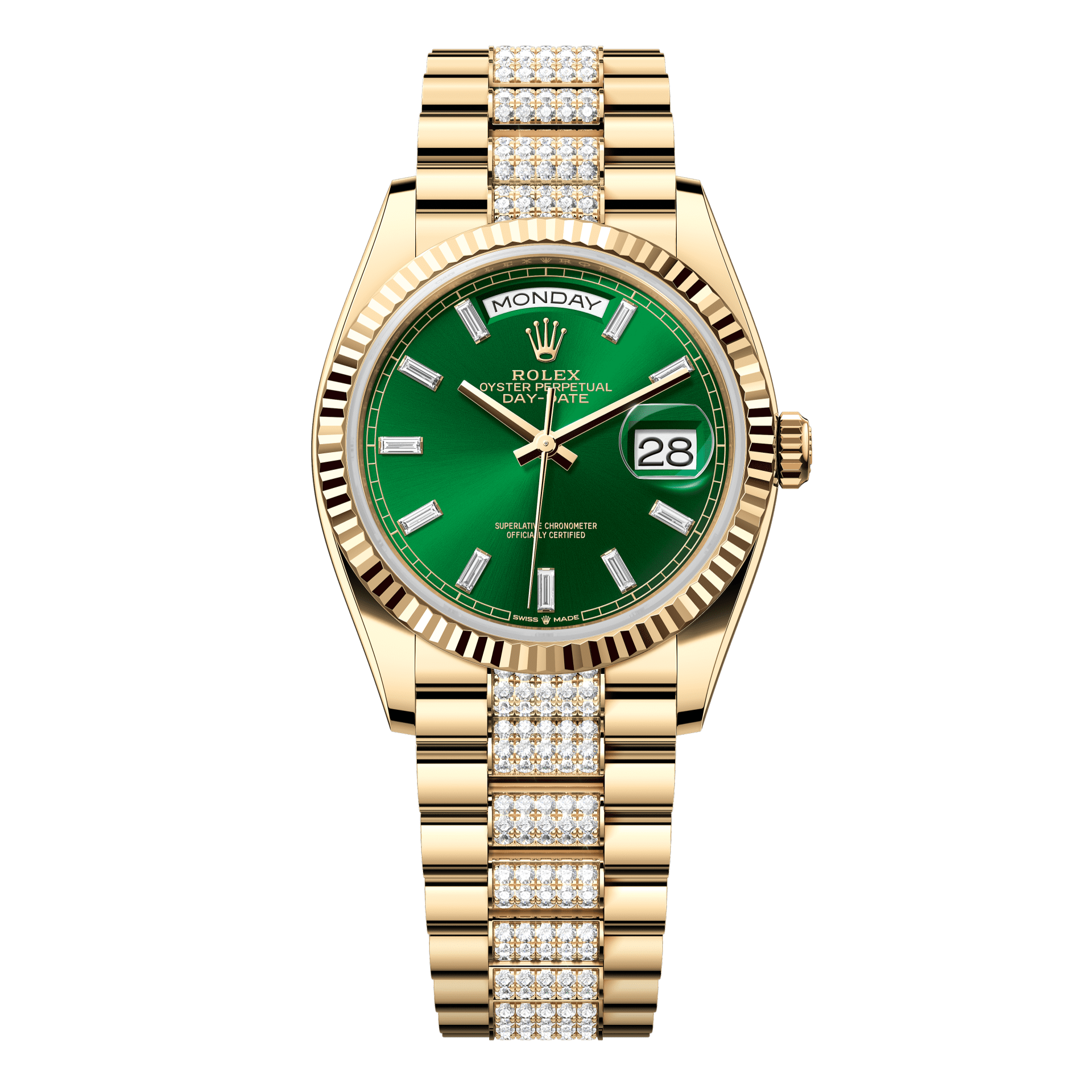 Discover the exceptional craftsmanship of the Rolex Oyster - a distinguished timepiece curated by WATCHXNYC. Embodying generations of horological mastery, this Rolex Oyster 36 mm Bright Green Set With Diamonds Dial 18k Yellow Gold Diamond-set President 128238-0131 demonstrates why Rolex stands among the world's most respected watchmakers.