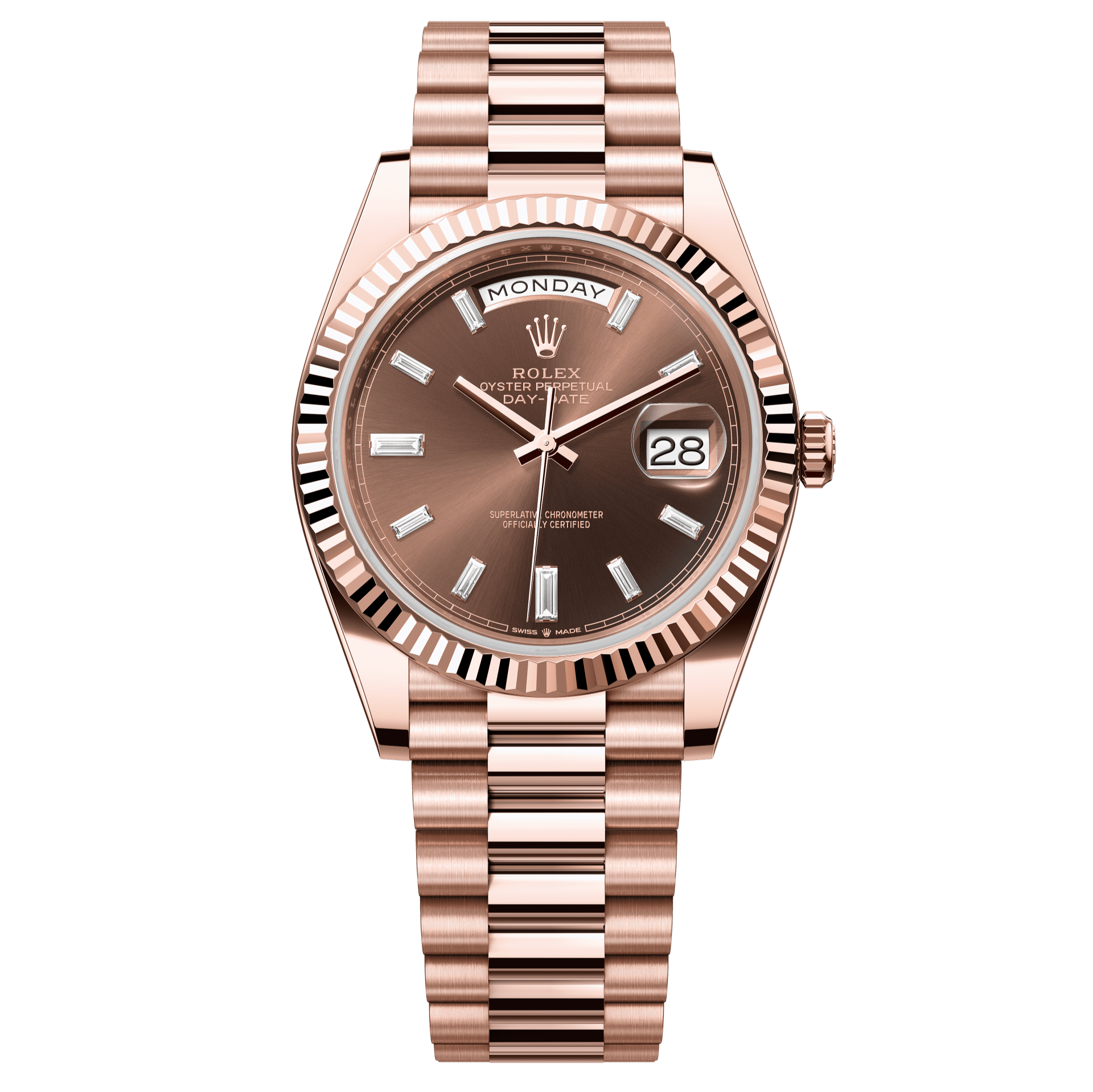 Rolex Oyster 40 mm Chocolate Set With Diamonds Dial 18 kt Everose Gold President, Semi-Circular Three-Piece Links 228235-0003