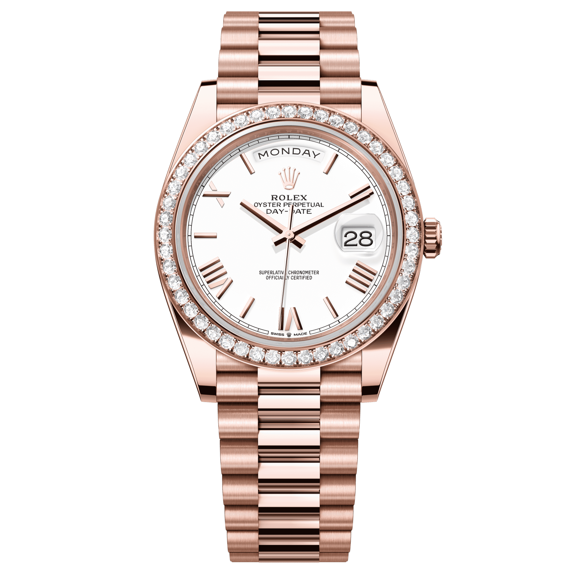 Rolex Oyster 40 mm White Dial 18 kt Everose Gold President, Semi-Circular Three-Piece Links 228345rbr-0012