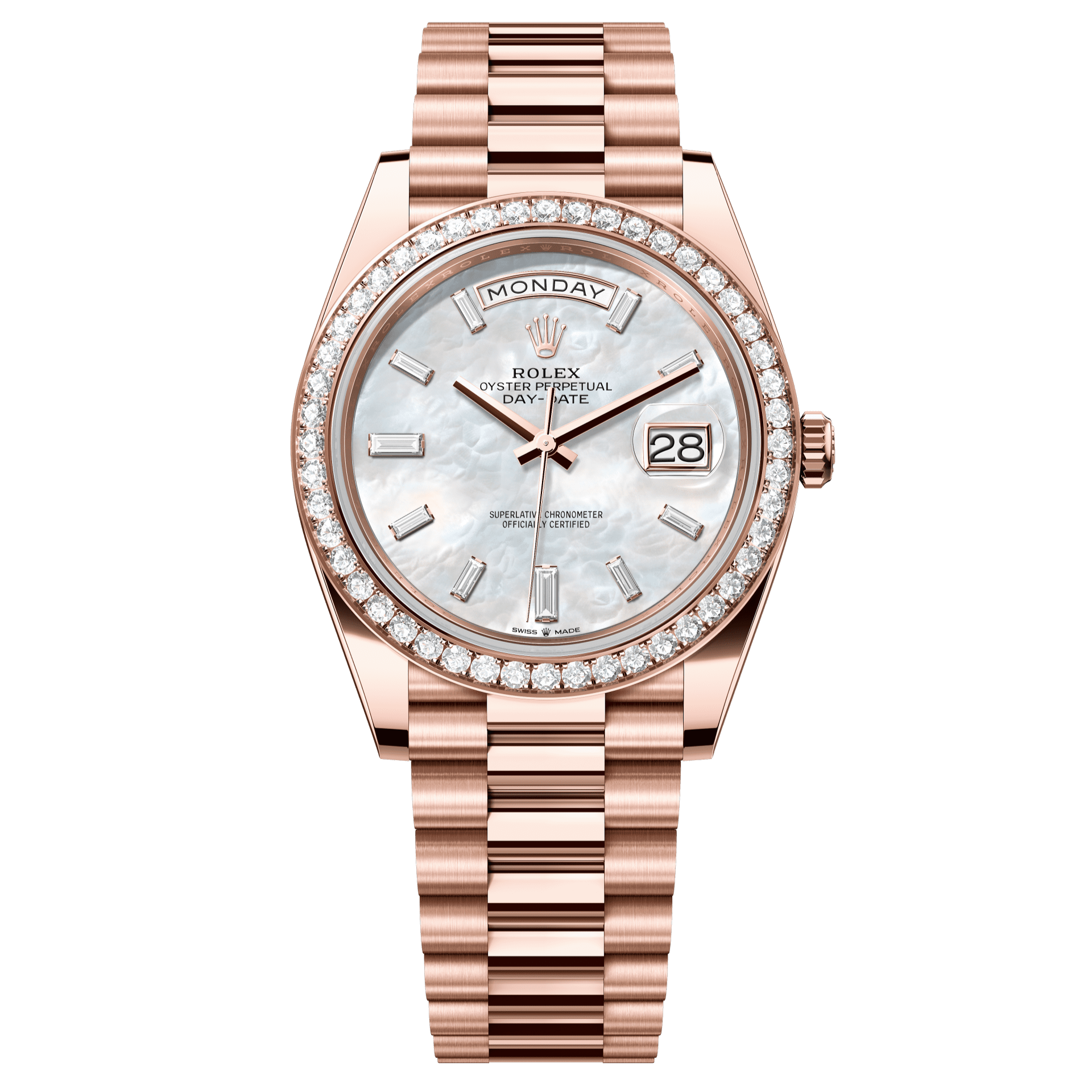 Rolex Oyster 40 mm White Mother-Of-Pearl Set With Diamonds Dial 18 kt Everose Gold President, Semi-Circular Three-Piece Links 228345rbr-0026